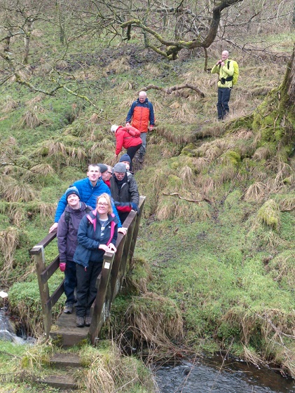 The inaugural weekend walk was on Saturday, 7 January 2023. Attended by 11 members, it started in the unspoilt Ribble Valley village of Downham, where "Whistle Down The Wind" and "Born and Bred" were filmed. It was eight miles of beautiful countryside near Pendle Hill. The weather was dire a few minutes before the walk started, but we were lucky that it remained dry for rest of the day with some blue sky and bright sunshine. The photograph shows the group crossing one of the several footbridges.